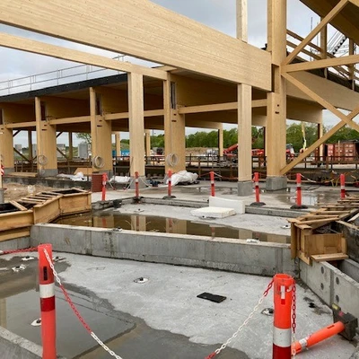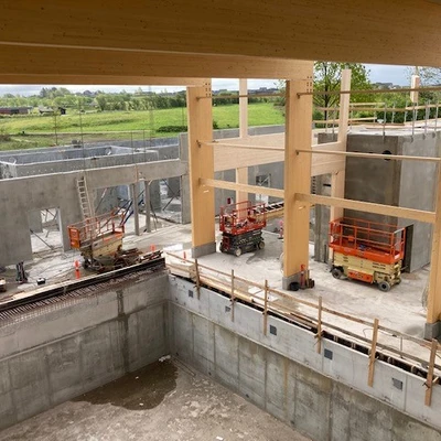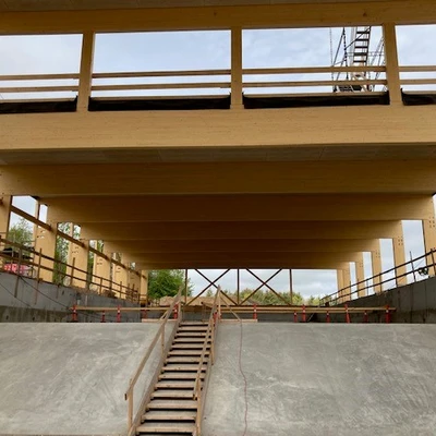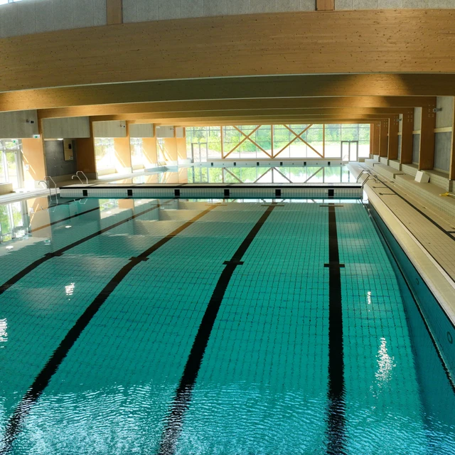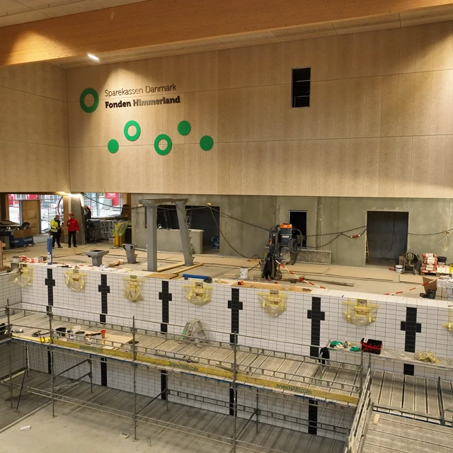 Synlig limtræskonstruktion i svømmehallerne og foyere.