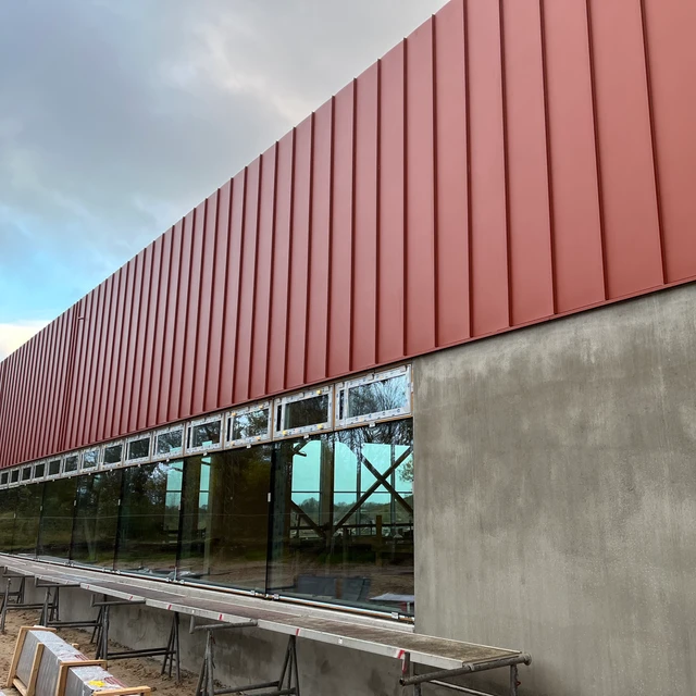 Kerne malerbehandles rød og vil således være et genkendeligt element når man bevæger sig igennem opklædningen. Farve RAL 3002, farven skal afstemmes endeligt når farven på facadepladerne er kendt.