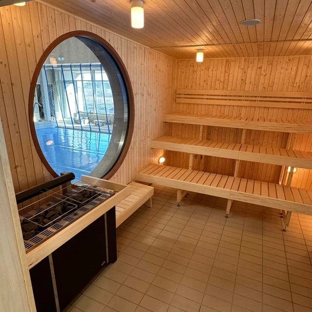 Omklædning samt væg imod sauna i varmvandsbassin.